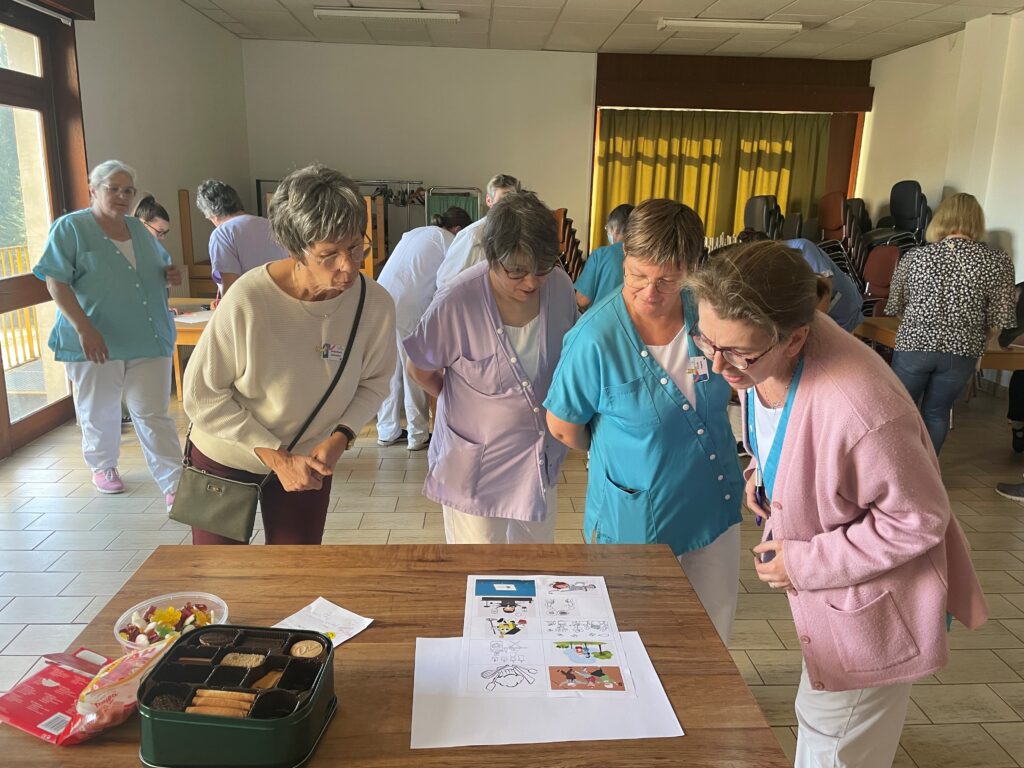 Une continuité des soins est assurée 24h sur 24, sept jours sur sept. Les infirmiers assurent le suivi des traitements médicaux en lien avec le médecin. Les aides-soignantes et les agents de service sont présents pour tous les besoins d’accompagnement nécessaires aux résidents. Ségolène, ergothérapeute et Lise, psychologue, complètent l’équipe pluridisciplinaire.
